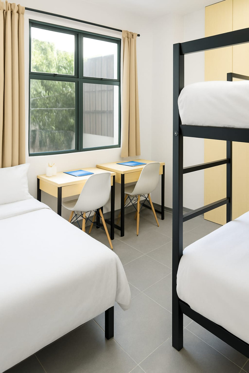 Whats included? A single bed Double Decker bed 3 wardrobes 3 Desk spaces Heated Showers Kitchenette Appliances: Fridge, Cooker, microwave & Kettle
